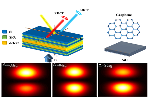 由于光子的自旋-轨道耦合效应,线偏振光束在均匀介质界面反射时将发生自旋相关分裂,即光自旋霍尔效应。该论文将新型二维材料—单层石墨烯引入到传统的缺陷光子晶体结构中,利用缺陷模将入射光能量聚集在石墨烯附近,从而引发了光子超强的自旋-轨道耦合效应。结合石墨烯高效的磁光性能,实现了外加磁场对反射光自旋分裂的极大增强与灵活调控。该成果为未来设计自旋光子学器件奠定了坚实的基础。