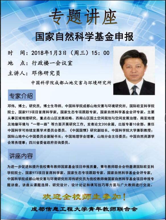 上一条:中国科学院成都山地灾害与环境研究所邓伟研究员应邀来我校作国家自然科学基金申报专题讲座