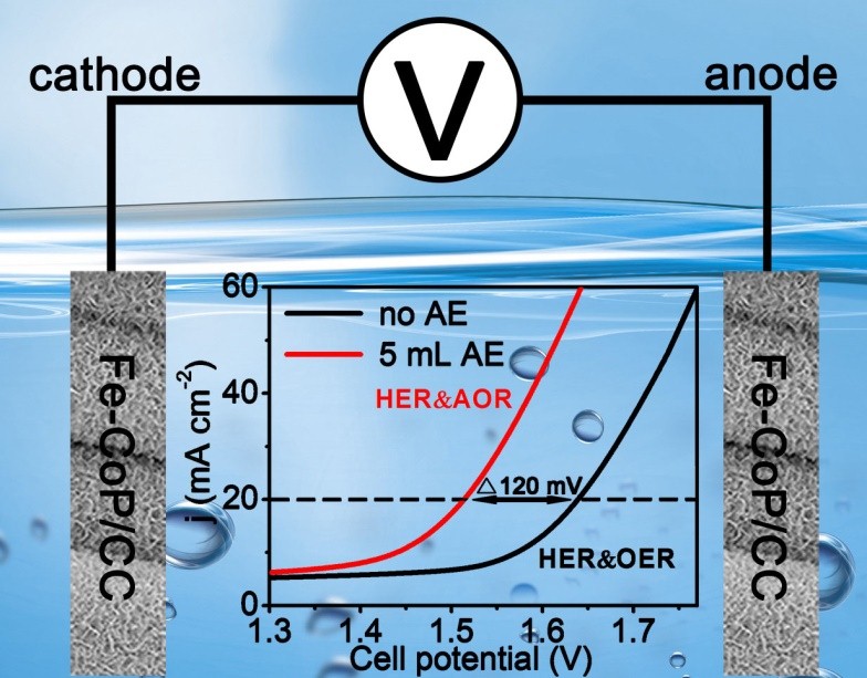 该文章首次提出了一种利用天然生物质(芦荟)电氧化来代替传统的水氧化的方法,采用多孔的铁掺杂磷化钴纳米阵列催化剂,从而达到高效电解产氢的目的。当碱性电解液中含有少量的芦荟提取液时,反应体系只需1.51 V的槽电压既能达到20 mA cm-2的电流密度,比没有芦荟提取液的情况降低了0.12 V,并可维持长时间的电化学稳定性和几乎100 %的法拉第效率。该论文的研究成果,为发展新型的基于生物质电氧化的水电解系统提供了思路和方法。