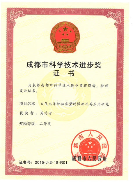 【本网讯】近日,2015年成都市科学技术进步奖评选结果公布,由我校大气科学学院周筠珺教授牵头,西南空管局等单位参与完成《大气电学特征参量的探测及其应用研究》成果,获得2015年成都市科学技术进步奖二等奖。