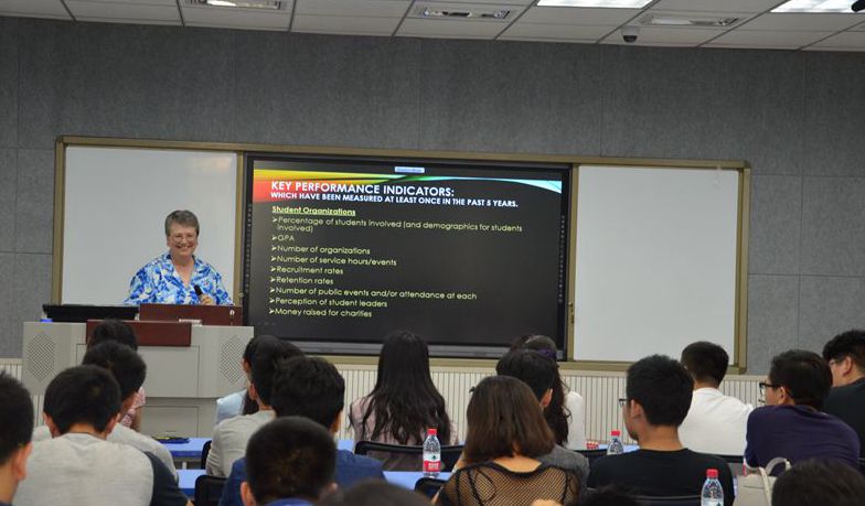 【本网讯】6月23日下午,美国新罕布什尔大学教授系列讲座之“Assessment of the Impact of Student Involvement ”在航空港校区1402教室举行,讲座主讲人为美国新罕布什尔大学学生事务处处长Mary Anne Lustgraaf,我校部分负责学生事务的老师和各学院学生会干部共50余人参加了此次讲座。本次讲座由学校国际交流与合作处和教师教学发展与评估中心协调组织,并得到了相关学院师生的支持。