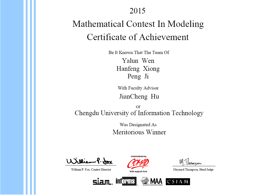 【本网讯】近日,2015年美国大学生数学建模竞赛成绩揭晓。通信工程学院的温亚伦、熊涵风、吉鹏,刘春、刘苹光、薛莉思获得Meritorious Winner(国际一等奖);应用数学学院的易晓冬、赵玥、吴志平获得Successful Participant(成功参赛奖)。取得了我院参加该国际竞赛以来的历史最好成绩,在此向全体参赛师生表示热烈的祝贺!