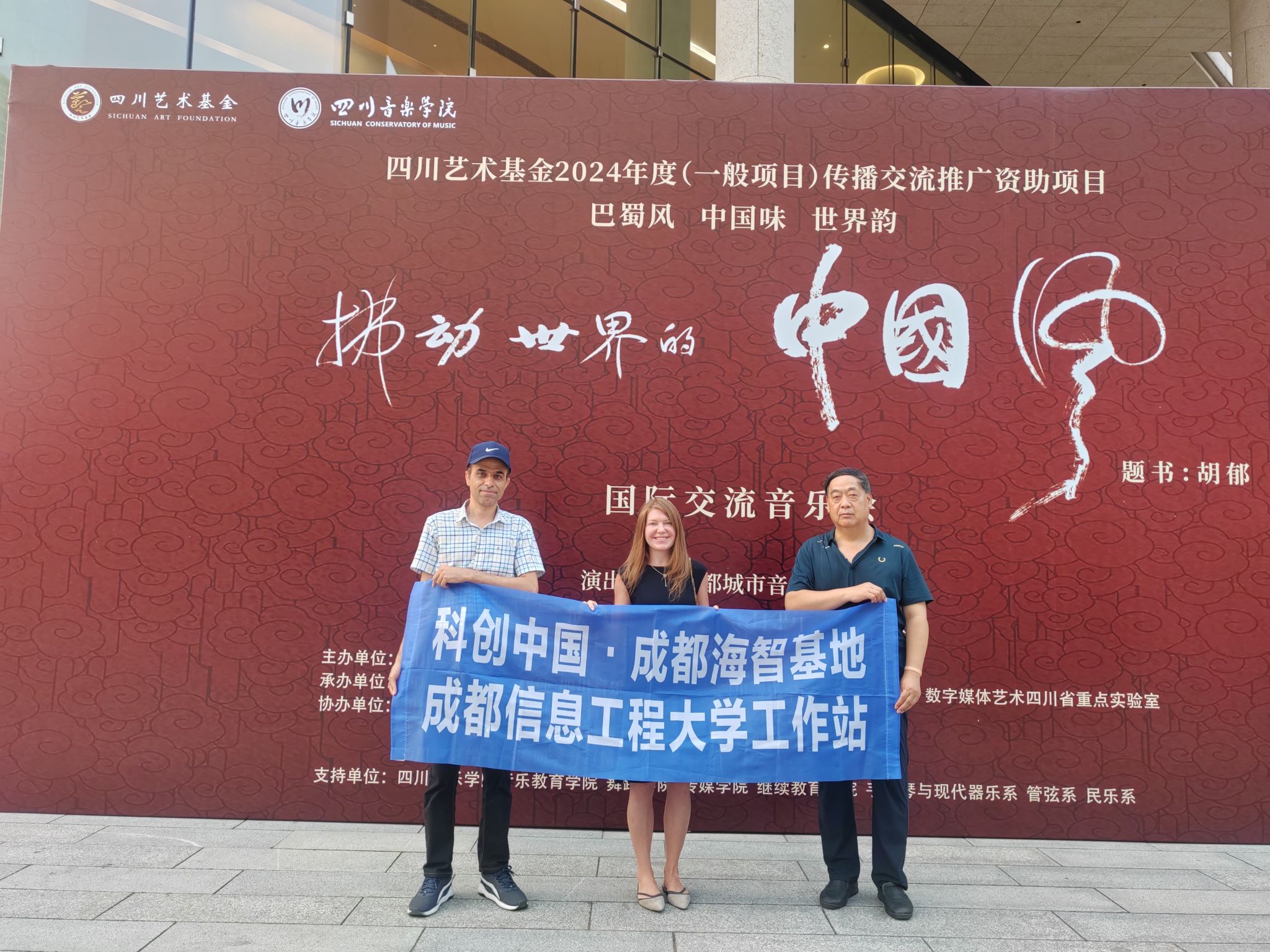 【本网讯】8月29日,应四川省科技厅外专处邀请,国际交流与合作处科创中国·成都海智基地成都信息工程大学工作站组织我校武志学、尤丽雅、慕迪三名外籍专家参加了在成都音乐厅举办的“拂动世界的中国风”外国作曲家创作的中国风格作品国际交流音乐会。此次盛会是四川艺术基金2024年度传播交流推广资助项目,更是一次跨越国界的文化对话与艺术碰撞。