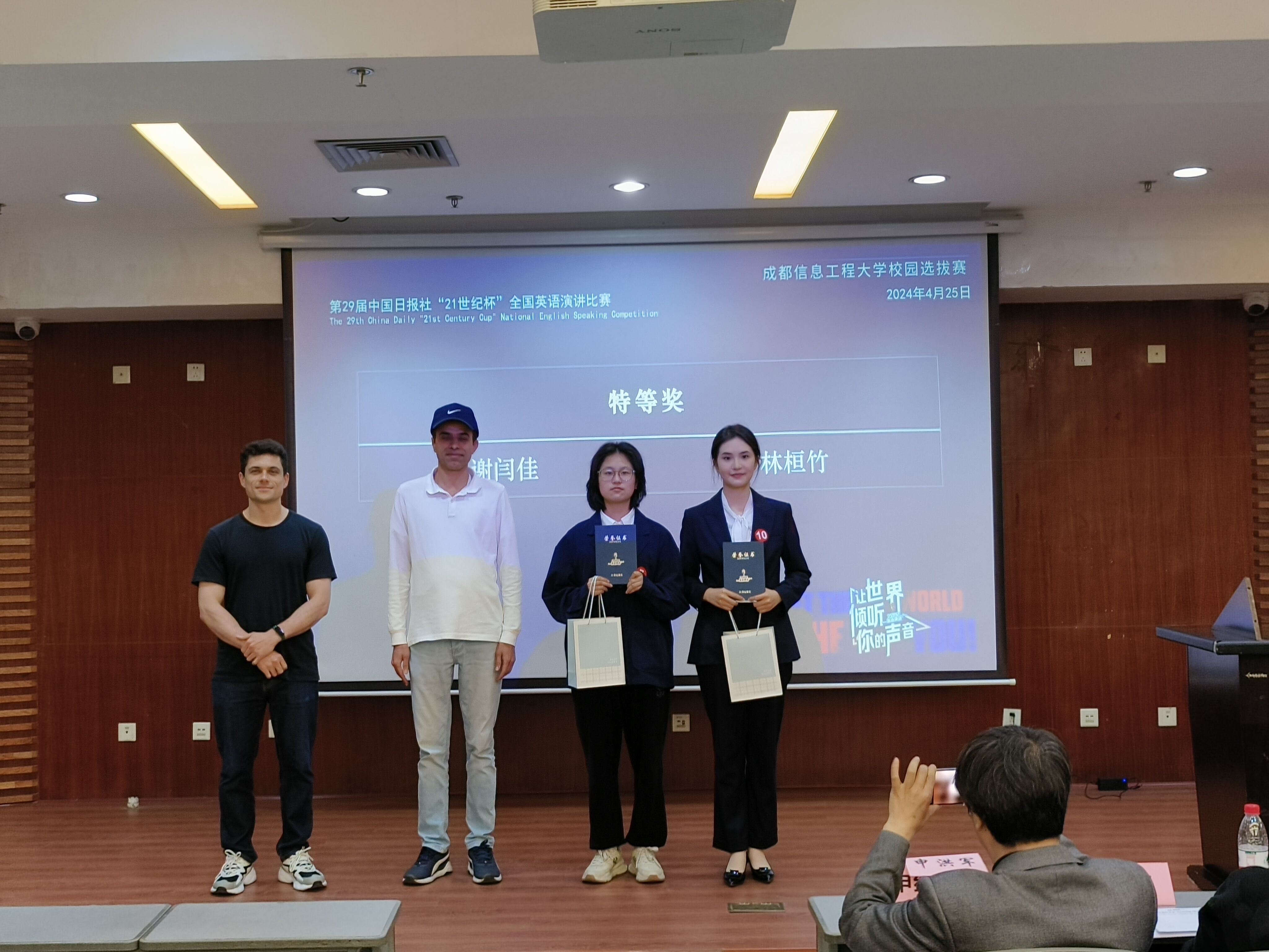 【本网讯】4月25日,第29届 “21世纪杯”全国英语演讲比赛(成都信息工程大学)校园决赛在航空港校区学术报告厅顺利举行。“21世纪杯”全国英语演讲比赛由21世纪报社主办,成都信息工程大学校园决赛由外国语学院承办,外语俱乐部协助组织。外国语学院教师杨佳颖、孙假梦、吴倩、张舒、申洪军担任评委,外教Moudi和Mark担任提问官。