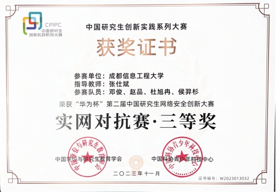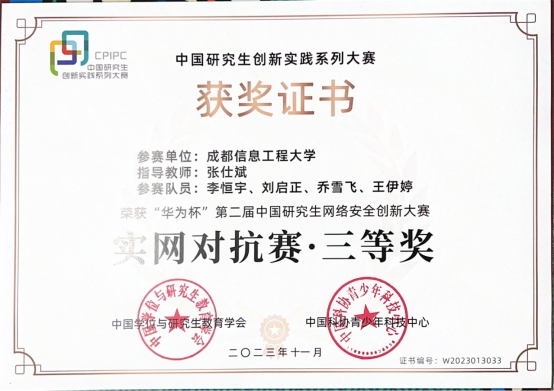实网对抗赛中,第一赛程AWD Plus主要考察漏洞挖掘、二进制漏洞分析、攻防对抗,第二赛程靶场综合渗透主要考察渗透测试、内网穿透、横向移动。选手们精神高度集中,开展了激烈的网络攻防对抗。我校网络空间安全学院矛盾实验室组建的2支队伍荣获实网对抗赛三等奖2项,成都信息工程大学获评“优秀组织单位”奖。
