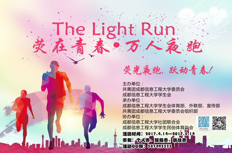 【本网讯】为更好地贯彻落实党的十八届三中全会关于“强化体育课和课外锻炼,促进青少年身心健康,体魄强健”的精神,由共青团成都信息工程大学委员会和成都信息工程大学学生会联合主办,校学生会体育部、校团委组织部承办的“三走”系列活动之“荧在青春·万人夜跑”启动仪式于4月14日晚8点在航空港校区第一田径场准时开始。