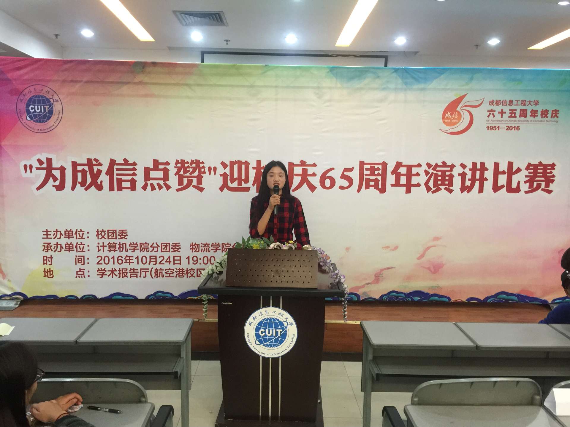 【本网讯】在我校65周年华诞之际,为弘扬成信精神,抒发爱校情怀,展现学生风采,10月24日晚,由校团委主办,计算机学院分团委、物流学院分团委协办的“为成信点赞”演讲比赛在航空港校区学术报告厅举行。校团委及学生工作处相关负责人出席活动并担任评委,本次比赛共吸引460余名同学报名参加。