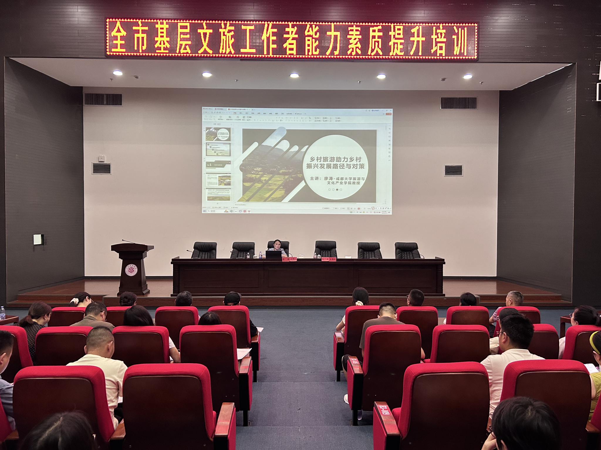 此次活动依托广元市文化广播电视和旅游局举办的“全市基层文旅工作者能力素质提升培训班”,面向全市120余名文旅系统骨干、乡村旅游带头人等开展授课。黄萍教授以《AI赋能广元特色文旅新生态》为题,结合剑门关、女皇故里等当地文旅名片,详解人工智能在文旅场景、产品及品牌推广中的应用路径,提出构建“科技+文旅+生态+康养”融合发展新模式。