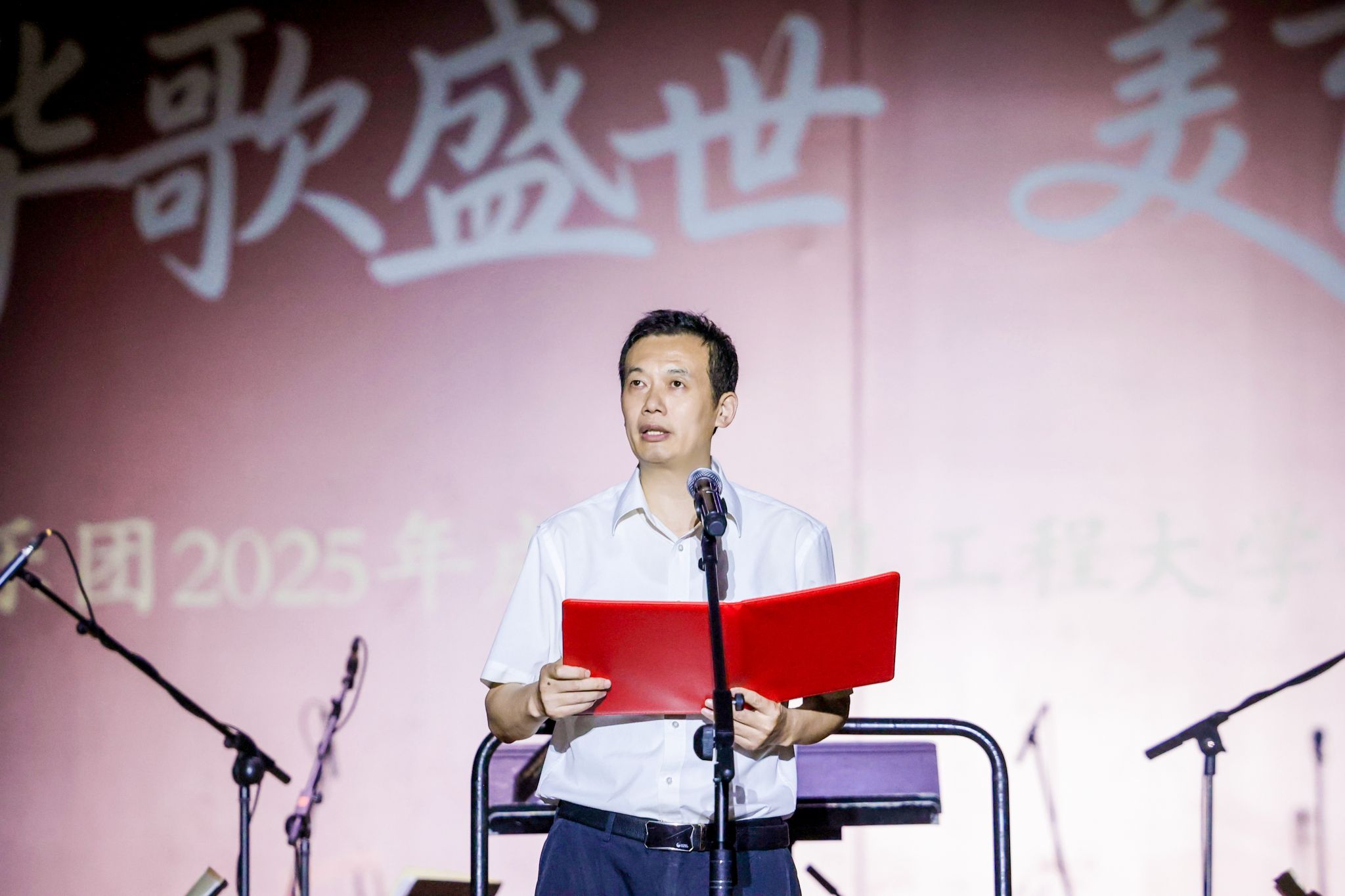 杨奇才在致辞中向四川爱乐乐团全体艺术家以及参与筹备的师生表示诚挚感谢。他指出,学校持续推动美育与专业教育的深度融合,将高雅艺术进校园作为提升育人质量的重要途径。他强调,本次活动不仅是大家接受艺术熏陶的良机,也是学校培养学生综合素养的重要平台。他希望同学们学会欣赏美、积极传播美、努力创造美,积极参与校园文化建设,全面提升综合素养,争做德智体美劳全面发展的时代新人。