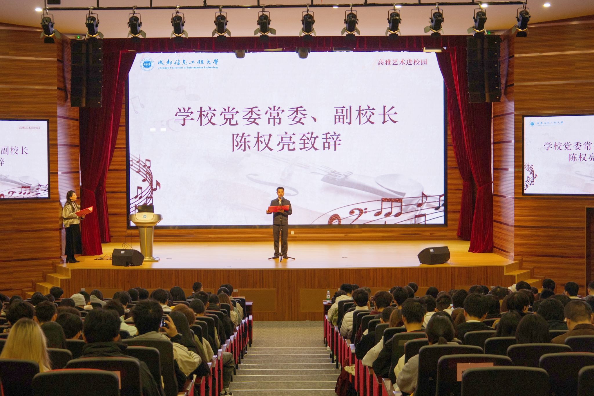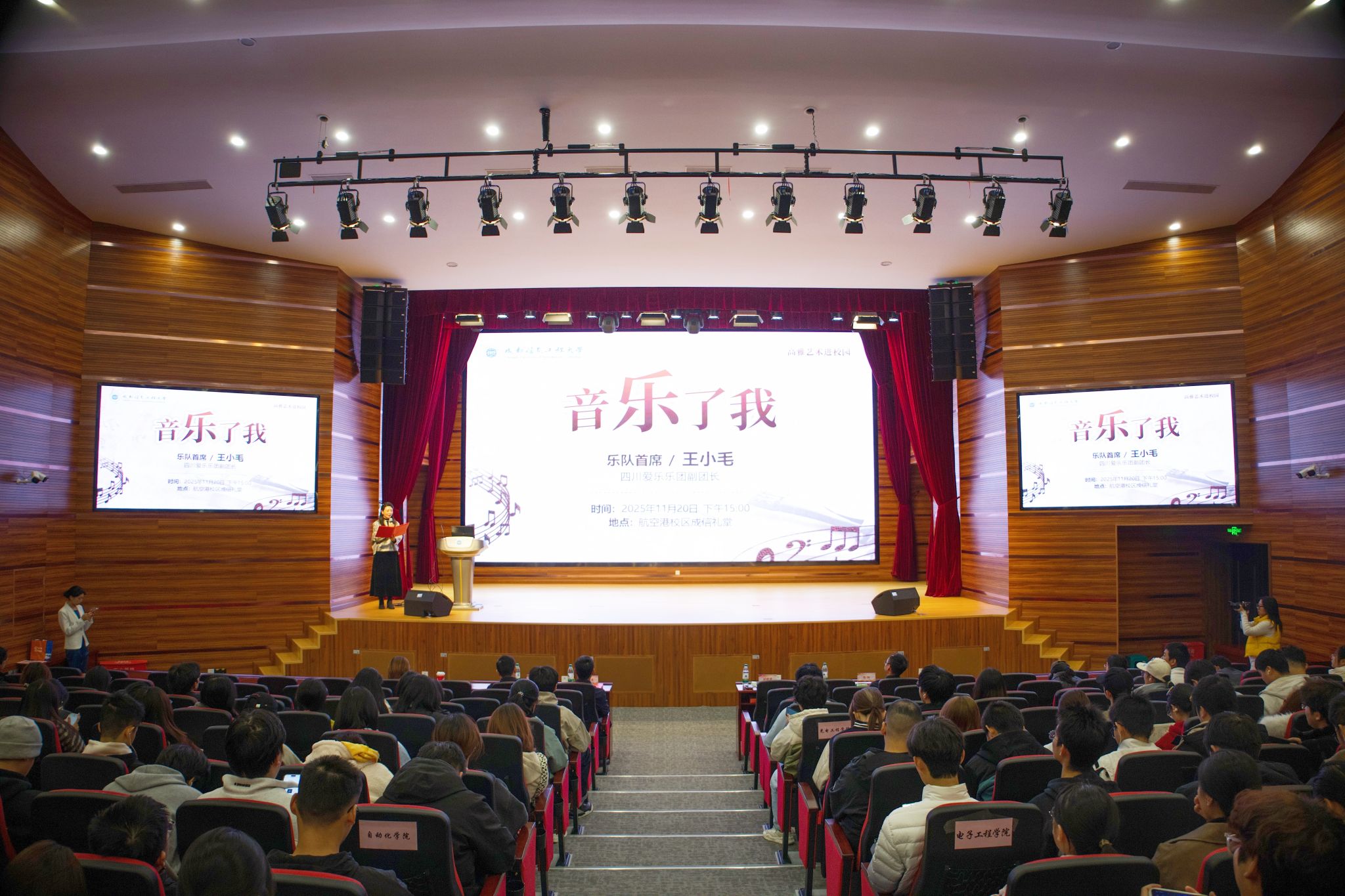 【本网讯】11月20日,2025年高雅艺术进校园“音乐了我”艺术鉴赏讲座在航空港校区成信礼堂举行。完美(中国)官方副校长陈权亮,四川爱乐乐团副团长、乐队首席王小毛,校团委书记刘琰琰,党委学生工作部副部长冯阳,以及四百余名师生代表参加活动。