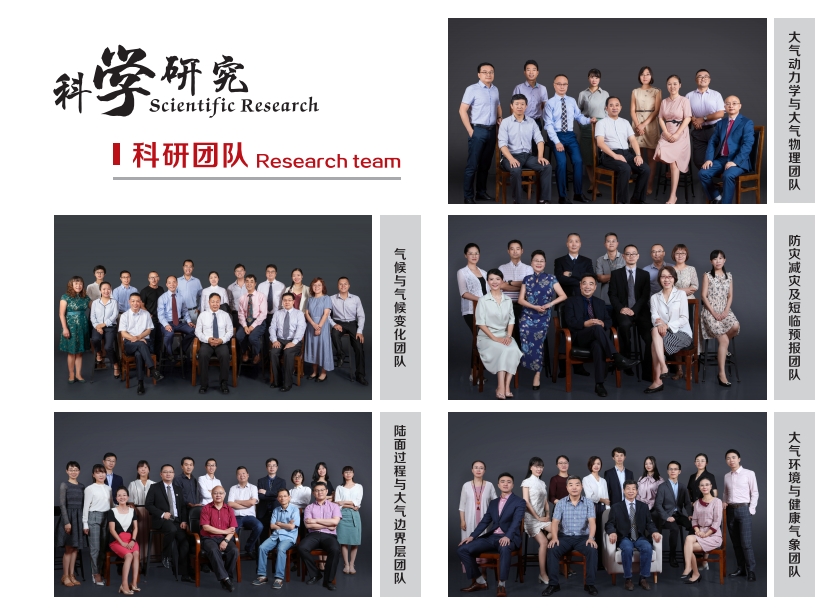科研团队有大气动力学与大气物理团队、气候与气候变化团队、防灾减灾及短临预报团队、陆面过程与大气边界层团队、大气环境与健康气象团队。