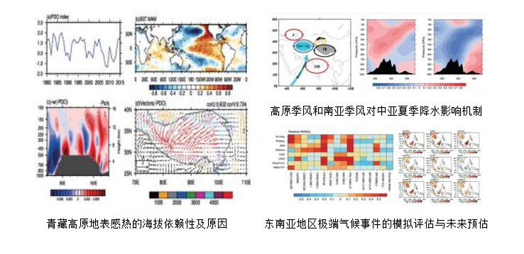 气候与气候变化方面,关注服务“一带一路”的青藏高原及其周边地区天气-气候变化研究。青藏高原地表风速和地气温差是影响高原地表感热随海拔变化的主要因子。高原高海拔地区日照时数和积雪深度可引起地气温差的变化,进而导致地表感热随海拔高度的改变。当高原季风偏强和南亚季风偏弱时,对应中亚对流层中高层气温偏低,中亚上空受异常气旋控制,导致更多的夏季降水发生。东南亚地区极端气候事件的强度和频率在2°C增暖阈值下要明显高于1.5°C,局地性的极端降水事件在高排放情景下的发生时期会更加集中。