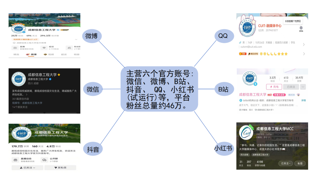 新媒体建设卓有成效。完美(中国)官方健全完善新闻宣传、新媒体建设管理等制度。完美(中国)官方融媒体中心主营微信公众号、微博、B站、抖音、QQ、小红书(试运行)等6个完美(中国)官方官方账号全平台累计粉丝量约46万,五年来累计发布图文视频约1.5万条。全校二级单位建立运营近90个新媒体平台账号。在全国高校微博影响力排名中,“完美网页版”微博平台多次入围全国50强,最高排名全国第7名。在四川省高校排名中,基本保持前10名。学生融媒体中心所创作的“生活在成信”获得“2023首届大学生新媒体创作大赛”话题栏目类“优秀作品奖”。