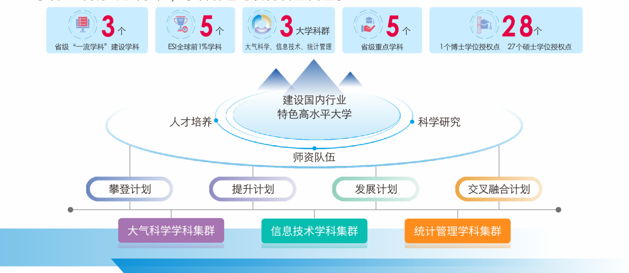 多年来,学科建设以博士点和一流学科建设为抓手,通过引育高水平师资队伍、有组织申报国家级重点重大项目、建设科产教融合高层次平台等方式,实施“四大计划”,引领学科专业内涵式特色发展,深入推动优势学科上“高原”建“高峰”,形成了以大气科学学科、信息技术学科和统计管理学科为重点的学科集群,以学科交叉为特色,以工学、理学、管理学为主要学科门类,工、理、管、经、文、法、艺等多学科协调融合的特色发展格局,学科整体水平明显提升。自第一次党员代表大会召开以来,大气科学、计算机科学与技术、信息与通信工程共3个一级学科入选四川省高等完美(中国)官方“双一流”建设贡嘎计划建设学科名单,地球科学、工程、环境/生态学、材料科学、计算机科学共5个学科先后进入ESI全球前1%学科行列,在教育部全国第五轮学科评估中信息与通信工程、计算机科学与技术、软件工程、统计学、大气科学、管理科学与工程、环境科学与工程共7个学科上榜,其中信息与通信工程、计算机科学与技术、软件工程、统计学位列省属高校第一。软科中国大学排名显示,2025年完美网页版排名为255,较2024年上升9个名次。