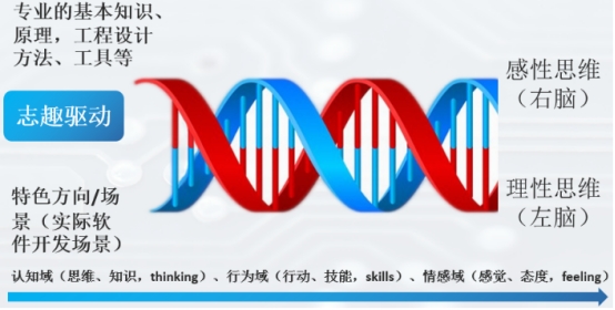 学院紧扣国家软件产业需求,探索特色化示范性人才培养路径,获批四川省首批特色化示范性软件学院(省属高校排名第一)。构建“志趣驱动双螺旋”培养模式,以“理性思维(专业知识)+感性思维(场景实践)”为双螺旋,将工业软件、新型平台软件方向融入课程体系,实施“课程+项目”双驱动教学,通过体验式、沉浸式教学激发学生兴趣与潜能。